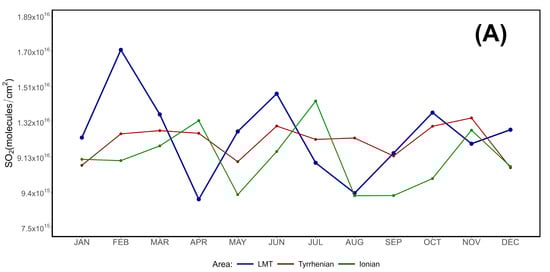 To highlight the differences between the two Calabrian coasts and broadly identify sources of SO2 emissions, in Figure 8B, the monthly means of TCSO2 (Total Column SO2) at points TYR4 and ION1 are reported. A comparison between the in situ (surface) SO2 concentration data and satellite tropospheric column data is shown in Figure 8C. In Figure 8D, points TYR1–3 are analyzed, which are further away from the Tyrrhenian coast (Figure 2), in order to highlight possible SO2 outputs from maritime shipping and volcanic sources. These points are representative of the western–seaside sector of the LMT, while ION1 is deemed representative of easterly air masses prior to their contact with the continent, which results in increased anthropogenic influence. The plots indicate that TYR1, whose distance to the Stromboli volcano is similar to that of TYR2, is less subject to the transport of air masses enriched in SO2.
