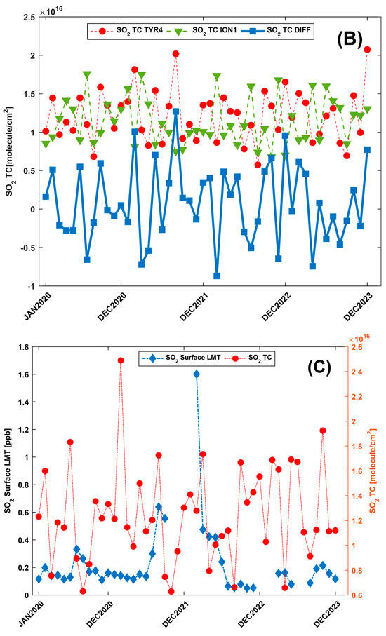 Tropospheric column densities gathered between 2020 and 2023 at the designated LMT, TYR, and ION locations were also analyzed to monitor multi-year variability, and the results are shown in Figure 8. This methodology was not applied to studies on the multi-year variability of other compounds previously assessed at the LMT. Specifically, in Figure 8A, the monthly variability of the total SO2 column measured by satellite is reported.