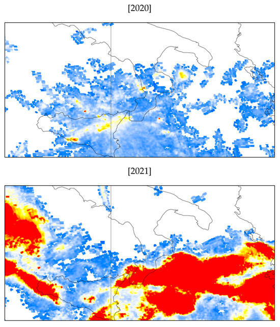 In order to show the large-scale influence of natural sources such as volcanoes in the area, Level 3 (L3) products were used to generate yearly maps of SO2 [114]. Specifically, maps referring to the period 2020–2023 were generated based on the COvariance-Based Retrieval Algorithm (COBRA) developed to compensate for a number of artifacts in Differential Optical Absorption Spectroscopy (DOAS) of SO2 via the retrieval of one specific parameter, which was the SO2 Slant Column Density (SCD) [115,116].