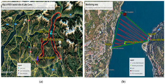 (a) Launch site of the ROV at Lake Como; (b) the ROV’s movement path is shown as a zigzag pattern.