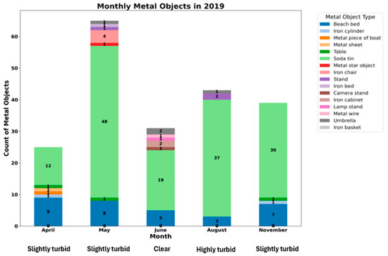 The stacked graph (Figure 4) visually summarizes the distribution of metal debris, highlighting that soda tins were primarily observed in January and March, while other metal objects were either rarely detected or absent in subsequent months.