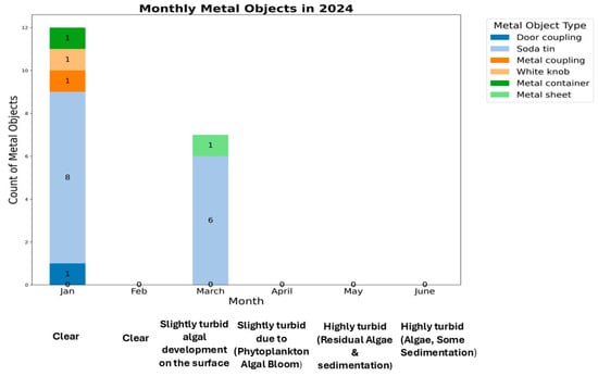 In January 2024, the most frequently observed items were soda tins (8) followed by white knobs (1), door couplings (1), metal couplings (1), and metal containers (1). No metal sheets were recorded. In February 2024, no metal objects were detected across any category, with all counts recorded as 0. In March 2024, the count was dominated by soda tins (6), with a single metal sheet (1) observed. No other metal objects were recorded. In April 2024, there were no metal objects observed, with all categories showing 0 counts. In May 2024, all categories showed 0 counts, indicating no detected metal debris. Similarly, in June 2024, no metal objects were detected, with counts remaining at 0 for all categories. The observed disappearance of certain metal objects in February and April–June 2024 may be attributed to several factors. It is possible that some debris was buried due to sedimentation or moved due to water currents, which could account for their nonvisibility in subsequent surveys. Based on video observations, it was noted that in some months, turbidity and sediment disturbance led to the partial or complete burial of objects, particularly larger debris like metal pieces. Additionally, in March 2024, dense algal blooms and higher turbidity obscured the objects’ visibility, making it difficult to identify debris, which might have led to an undercount. Furthermore, it is not confirmed whether any cleaning of the lakebed occurred between the surveys, as this was outside the scope of the study. However, the lack of visible debris in specific months may reflect natural processes, such as the movement of debris due to currents or sedimentation, rather than any active removal or cleaning efforts. No organized efforts to collect or remove underwater debris were documented in the study area during the survey period. The variation in observed debris counts between surveys may result from natural factors such as sedimentation burying objects, changes in visibility conditions, and debris movement influenced by lake currents and turbulence. These natural processes could obscure the detection of certain items over time, contributing to variability in debris counts across months.