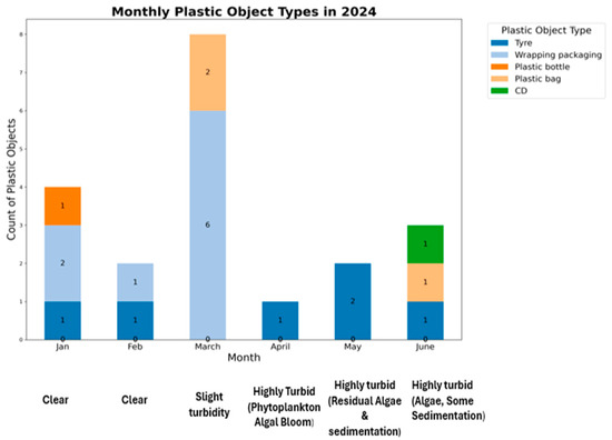 Figure 6 effectively visualizes the monthly distribution of plastic debris types throughout 2024. The data highlight variations in the presence of different plastic objects, with wrapping packaging being most frequently observed in March, while other categories such as tires and plastic bags appeared in different months.