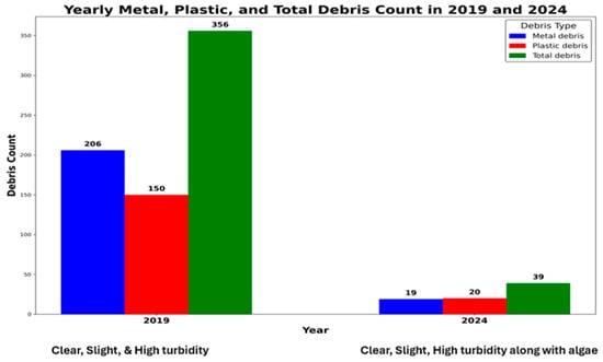 Our data do not analyze algal composition or toxicity, but the visibility challenges align with findings on algal blooms’ effects on water transparency [61,62,63,64]. Comparing 2019 and 2024, debris decreased significantly, from 356 to 39 items, suggesting potential improvements in management or environmental conditions that require further investigation.