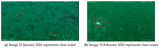This section presents a visual analysis of water turbidity and algal presence in Lake Como during the survey periods of 2019 and 2024. Screenshots captured from ROV video recordings highlight the differences in water clarity and algal development across various months, providing a clearer understanding of the environmental conditions that impacted debris detection efforts. These visual comparisons aim to support the findings on the influence of algal blooms on underwater visibility. Figure 8 visually represents the clear underwater visibility observed in January and February 2024, where objects were easily identifiable and countable. Both months exhibit similar conditions for object detection, as indicated by the red markers highlighting the debris presence.