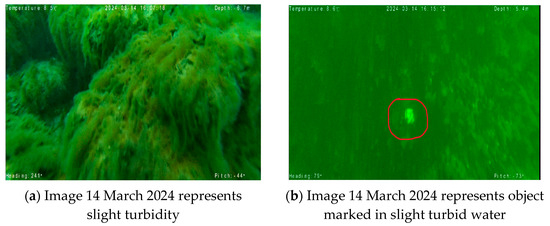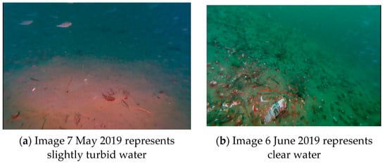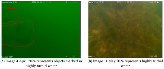 Turbidity: Turbidity was qualitatively assessed based on the clarity of the water in each video. Instances where high turbidity or algal blooms hindered object identification were noted. Water turbidity was visually assessed based on photographs obtained using the ROV. Due to the absence of direct turbidity measurements (e.g., NTU values), water clarity was categorized into three qualitative levels based on visual observations:
