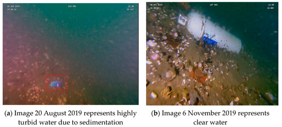 However, advancements in ROVs have transformed underwater debris monitoring by providing automated, scalable solutions capable of real-time data collection and continuous video capture in different aquatic environments [18,19,20]. Despite these technological advancements, environmental factors such as water turbidity and light attenuation, particularly during algal blooms in summer and early autumn in Italy, can significantly impact ROV performance, leading to reduced detection efficiency [21,22].