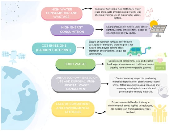 The detection of a greater environmental impact of the activities of healthcare institutions has been linked to air conditioning; the use of electromedical material for diagnosis; surgical procedures; pharmaceutical products and single-use products such as sterile gloves, gowns, masks or syringes, as well as the transfer of patients themselves to receive healthcare [18,19]. Based on analyses of these forms of damage, various actions in favor of sustainable healthcare stand out.