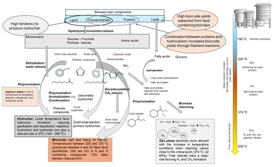 Reactions involved in HTC and HTL follow a similar structure, including hydrolysis, dehydration, decarboxylation, condensation, polymerization and aromatization, with the formation of 5-HMF (5-(hydroxymethyl)furfural), aldehydes and ketones, which are distributed in the aqueous phase, but the less severe conditions of HTC make lignin relatively inert [87,88,89]. It is also considered that the biocrude formed during the HTC process acts as a precursor of hydrochar [90]. Thereby, two routes are differentiated during char formation, considering primary hydrochar which one derived from solid–solid reactions of biomass, having thus a similar structure with the original raw material, and secondary char as that one derived from the condensation and polymerization reactions of compounds found in the liquid phase, showing a microsphere type structure [91]. Under subcritical conditions, ionic reactions are dominant (involving protons and hydroxyl ions derived from water), whereas free radicals are the main species involved in the conversion of organics into gaseous species when reaching supercritical conditions [92,93]. Gas production increases above 300 °C because water density decreases at this point, resulting in the disruption of ionic product formation and an enhancement of the free radical mechanism. Consequently, higher gas yields are expected as the temperature increases [94].
