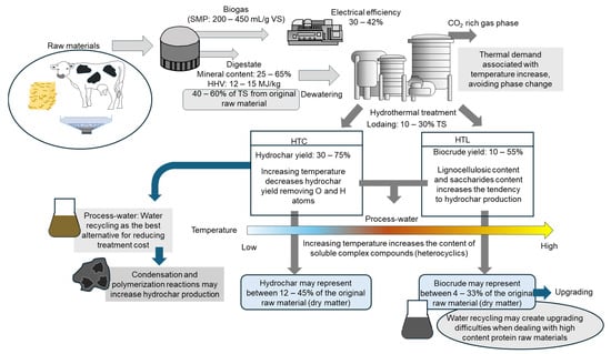 The common practice is to consider hydrochar as a valuable resource. Nevertheless, metals are reported to accumulate in this solid material, thereby becoming a concern when using it as an agronomic amendment, as they may increase the total content and bioavailable metal content in soils [219]. Wang et al. [220] reported that although most heavy metals accumulated in hydrochar, the carbonization process reduced their bioavailability, except for arsenic, thereby recommending the application of hydrochar to non-farming soils. If revenues from selling hydrochar are eliminated, the feasibility of these technologies is greatly reduced. Adding this fact to the delicate economic balance of digestion plants, the introduction of a highly costly process can only be justified when digestate land application encounters significant rejection from the local population. Figure 2 illustrates a schematic representation of the primary products generated by combining anaerobic digestion and hydrothermal treatment technologies.