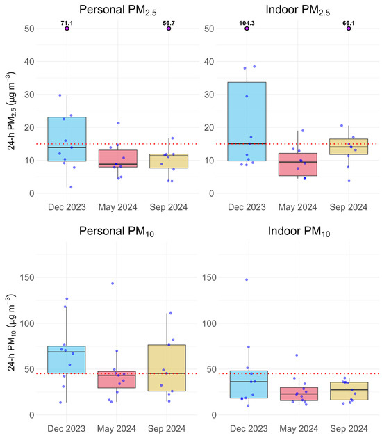 Personal and indoor PM2.5 and PM10 measures are compared to the World Health Organization’s (WHO) 24-h air quality guidelines (15 µg m−3 for PM2.5 and 45 µg m−3 for PM10) in Figure 1 [42]. Exposures exceeding these guideline levels may be associated with increased health risks [42]. All measures had observations exceeding the WHO guidelines during each sampling campaign (except indoor PM10 in September 2024), despite median personal and indoor PM2.5 and indoor PM10 concentrations below the guidelines (except one median personal PM10 concentration at the guideline in September 2024). Overall, 29% (18/62) of personal and indoor PM2.5 samples and 33% (21/64) of personal and indoor PM10 samples exceeded the WHO guidelines (Table 2) [42]. The campaign with the highest percentage of samples exceeding the WHO air quality guidelines was December 2023.