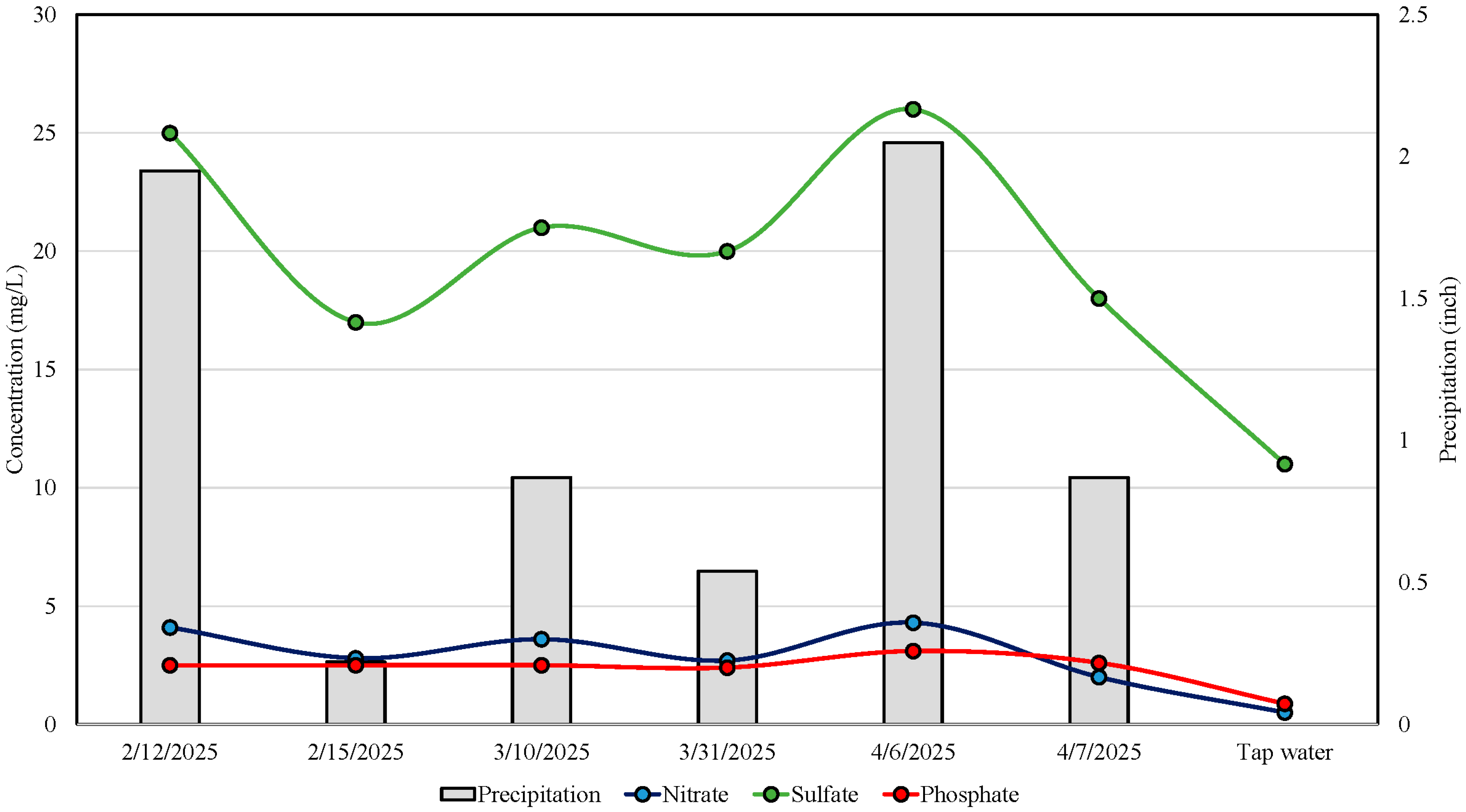 Figure 1. Mean concentrations (mg/L) of nitrate, sulfate, and phosphate measured in rainwater samples collected during six precipitation events between February and April 2025, shown alongside corresponding daily precipitation data. Tap water concentrations are included as a reference baseline. Precipitation data were obtained from the National Oceanic and Atmospheric Administration (NOAA) weather database [28].