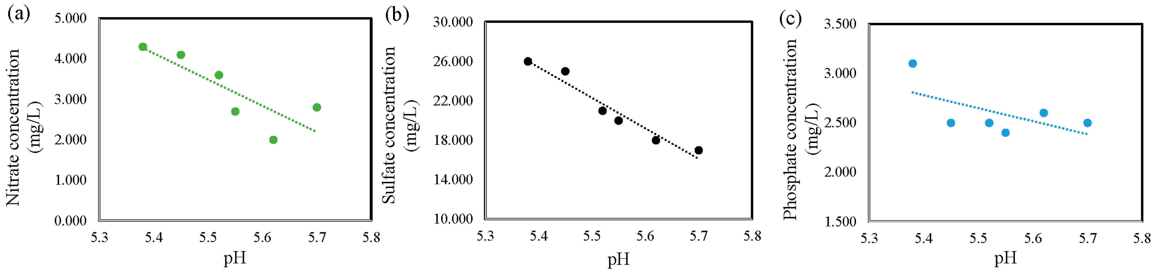 Figure 3. Graph showing the variation in major anion concentrations as a function of pH in rainwater samples: (a) nitrate, (b) sulfate, and (c) phosphate concentrations (mg/L) exhibit distinct trends across the observed pH range.