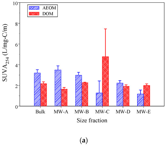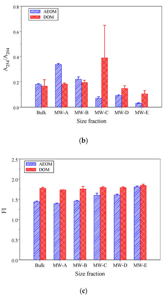 The SUVA254 is a robust indicator of aromaticity [17,18]. SUVA254 values greater than 4 L/mg-C/m indicate a predominance of macromolecular, aromatic, hydrophobic compounds, while values below 3 L/mg-C/m suggest low molecular weight, hydrophilic compounds poor in aromatics [18]. A254/A204, an indicator for the ratio of hydrophobic to hydrophilic compounds, often correlates with SUVA254 [39]. Both SUVA254 and A254/A204 showed decreasing trends with decreasing molecular weight in AEOM fractions (Figure 2a,b), a dependency of optical properties on molecular size that is consistent with previous findings [27,34]. However, for DOM, these values were not significantly different across fractions, except for the much higher values in the MW-C fraction (1–3 kDa), suggesting this fraction may be enriched with humic- and fulvic-acid like matter [35].