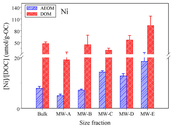 The average mass recoveries for OC (89 ± 2% for DOM, 107 ± 9% for AEOM) and Ni (111 ± 16% for DOM, 103 ± 9% for AEOM) fell within reasonable ranges (100 ± 25%) for such fractionation procedures, ensuring procedural accuracy [25,44]. The bulk DOM concentration of Ni (9.1 ± 0.2 μg/L) was similar to background levels in nearby river waters [24], while the bulk AEOM Ni concentration was 2.73 mg/kg.