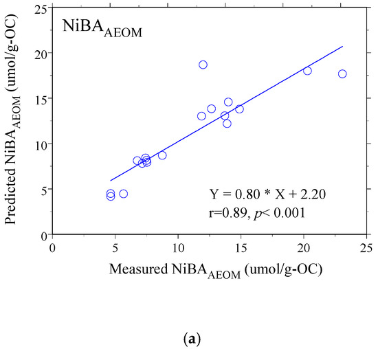 The correlation between predicted and measured NiBA to size-fractioned (a) DOM and (b) AEOM solutions. The solid line in each panel indicates the linear regression fit. In the corresponding equations, Y and X denote the predicted and measured NiBA values, respectively.