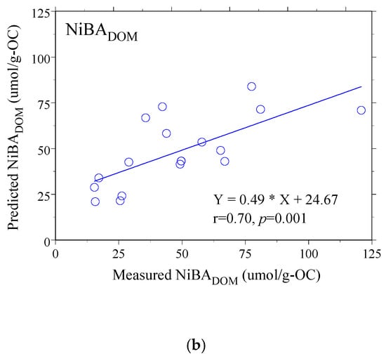 The results of the MLR analysis were revealing. For AEOM, the model demonstrated excellent predictive power (r = 0.89, p < 0.001), reinforcing that its binding behavior is well-described by these optical proxies. More importantly, for the whole DOM, the MLR model successfully established a strong, statistically significant relationship (r = 0.70, p = 0.006), despite the weakness of the individual correlations. This success demonstrates that while no single proxy can capture the complexity of Ni binding in the unaltered water, a holistic model incorporating multiple facets of DOM character can effectively predict its behavior [62,63,64]. The strong agreement between the values predicted by these models and the actual measured NiBA values is visually confirmed in Figure 4a,b, underscoring the models’ validity.