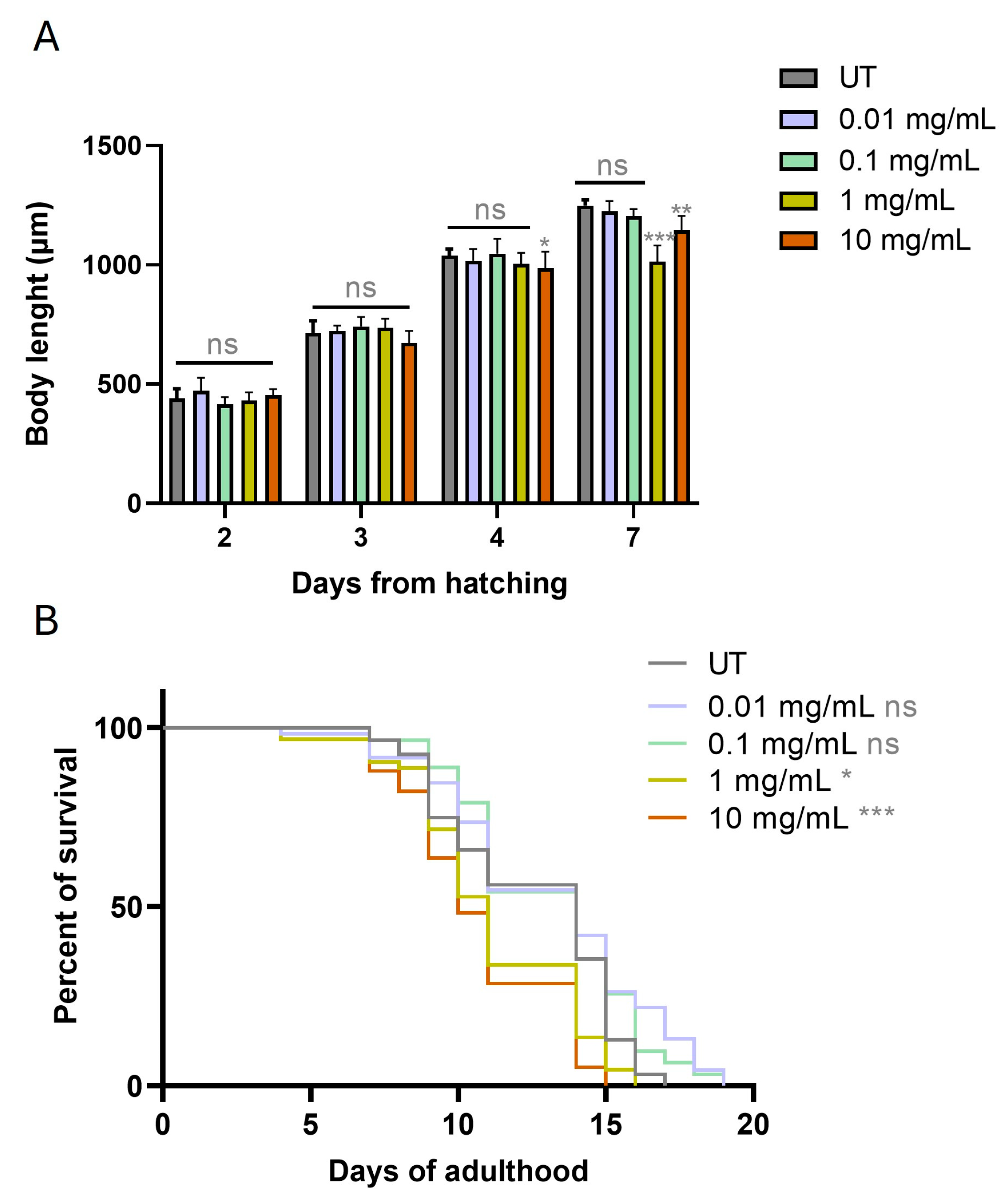 Figure 1. Impact of MPs on body length and survival in C. elegans. (A) Assessment of worm body length following exposure to increasing concentrations of MPs (0.01, 0.1, 1, and 10 mg/mL) at defined time points. Untreated worms (UT) were taken as reference. Measurements were performed from head to tail, and data represent the average of three independent replicates. (B) Kaplan–Meier survival curves comparing wild-type N2 worms exposed to MPs with untreated controls (UT). N: 80 animals per condition per experiment. Statistical significance is indicated as follows: * p < 0.05, ** p < 0.05; *** p < 0.001; ns: not significant.