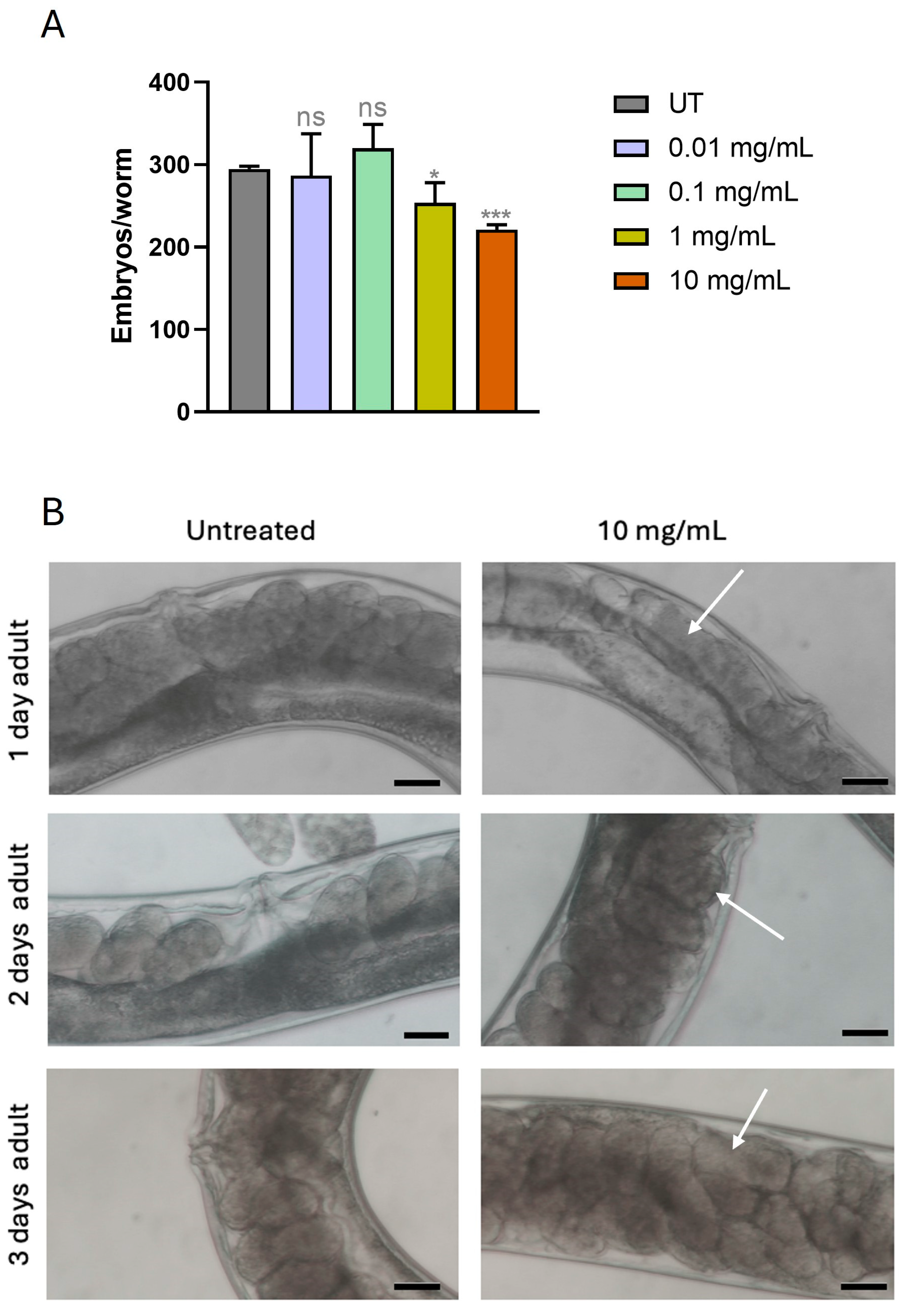 Figure 4. Effect of MPs on C. elegans reproduction. (A) Average embryos production per worm of animals supplemented with different concentrations of MPs. Untreated worms were taken as reference. Bars represent the mean of three independent experiments; asterisks indicate the p-values (log-rank test) normalized to the control (* p < 0.01, *** p < 0.001, ns: not significant). (B) Morphological analysis of embryos in 1-, 2-, and 3-day-old adult nematodes exposed to a concentration of MPs at 10 mg/mL and in untreated controls. Structural alterations in embryos are indicated by arrows. Images were acquired using a Zeiss Axiovert25 microscope at 32× magnification. Scale bar: 20 μm.