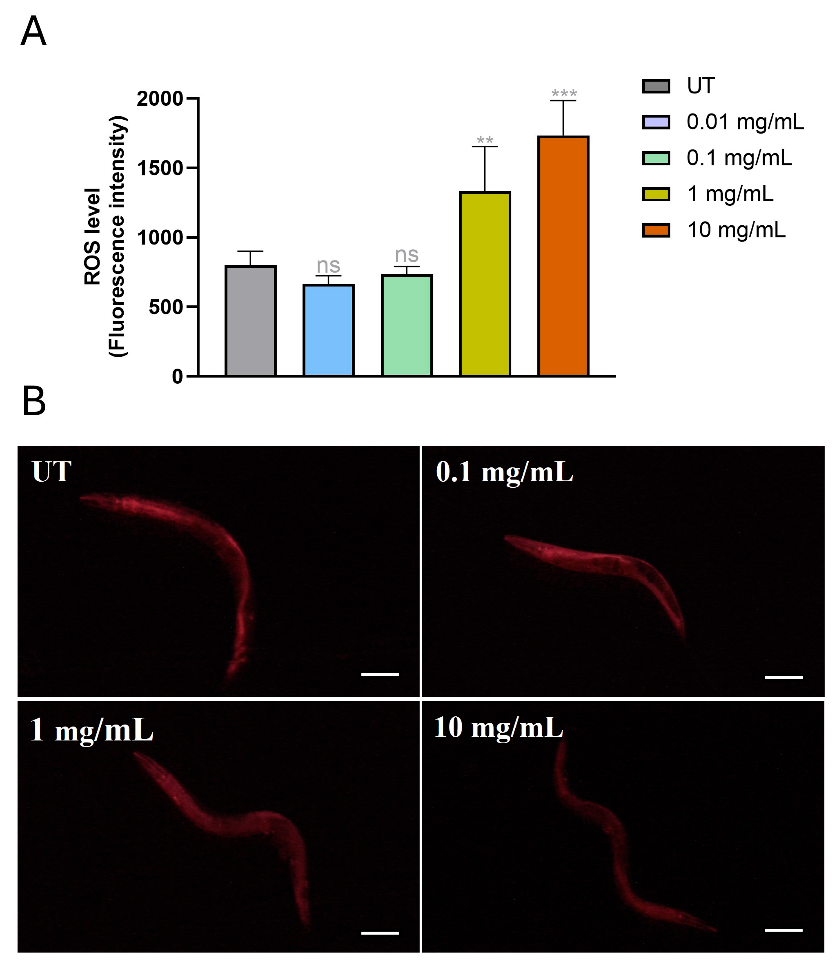 Figure 5. Assessment of oxidative stress in MP-treated worms. (A) Reactive Oxygen Species (ROS) levels in 4-day-old adult individuals treated with MPs at concentrations of 0.01 mg/mL, 0.1 mg/mL, 1 mg/mL, and 10 mg/mL, compared to the untreated control group (UT). Asterisks indicate statistically significant differences (** p < 0.01, *** p < 0.001, ns: not significant) relative to the control group. (B) 4-day adults, treated with MPs from embryos hatching, were stained with MitoTracker® Red for mitochondrial ROS. Scale bar is 100 μM.