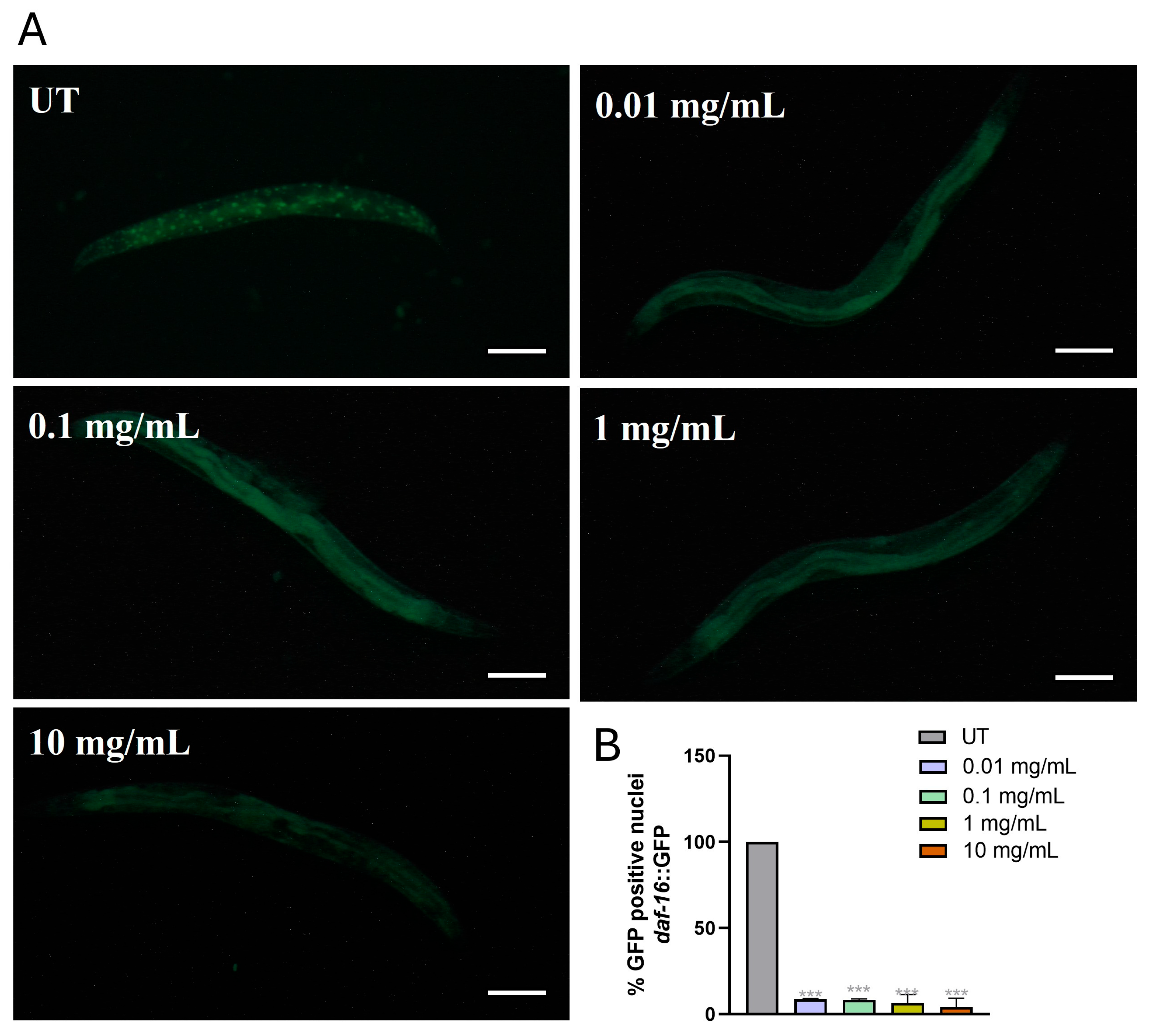 Figure 7. Visualization of DAF-16 translocation in C. elegans nuclei. (A) Analysis of the translocation of DAF-16 in the nucleus in the transgenic daf-16::GFP strain. Fluorescence microscopy of worms at the stage of 4-day adult treated with MPs. Scale bar  =  100 μm. (B) Percentage of GFP-positive nuclei. Statistical analysis was evaluated by one-way ANOVA with the Bonferroni post-test; asterisks indicate significant differences (*** p  <  0.001). Bars represent the mean of three independent experiments with n  =  20.