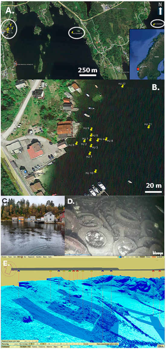 (A) Sampling of the tire dump site and position of Control Site 1 in Eikangervågen and Control Site 2 across the bay (Inset: Hjelmås (red dot) on the west coast of Norway). (B) The 12 stations are arranged as orthogonal transects from the center (Map source: Google maps). Images showing the Hjelmås site above (C) and below the surface (D). (E) Bathymetric mapping showing underwater terrain and site depths (depths in Table 1).
