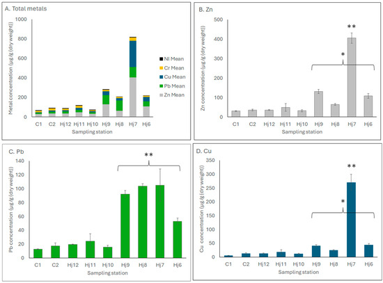 Metal concentrations in sediments collected from the tire dump (Hj6–12) and control site (C1, C2) (mean values ± standard deviation, n = 3). (A): Total metal concentrations, (B): Zn concentrations, (C): Pb concentrations, and (D): Cu concentrations. * denotes significant difference from control at 0.05, ** denotes significant difference from control at 0.01 (one-way ANOVA, post hoc Tukey test). Full dataset for metal analysis available in Table S2 (Supplemental Materials).