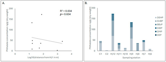 Phthalate concentrations in sediments collected from the tire dump (Hj6–12) and control sites (C1, C2). (A): Shows no relationship between distance from the tire dump and total phthalate concentration, (B): concentrations of phthalates in sediments.