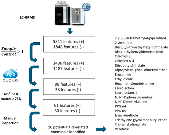 Schematic representation of data-processing steps following non-target analysis, and the resulting list of 20 purported tire-derived compounds.
