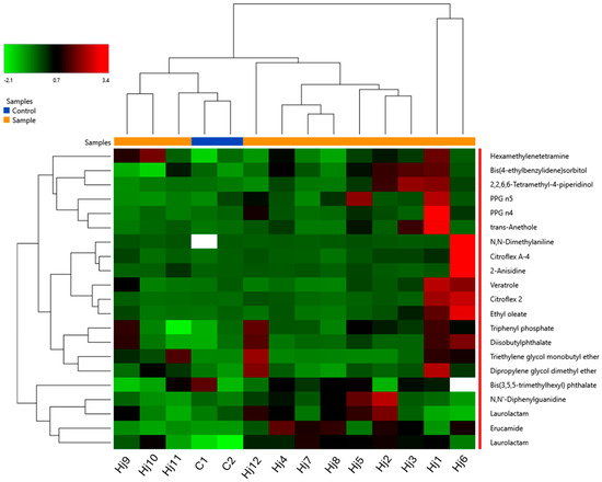 Heatmap of LC–HRMS features detected across all sampling sites (based on chromatographic areas), with samples ordered by hierarchical clustering. The dendrogram illustrates the grouping of stations based on the similarity of their chemical profiles (20 suspected compounds).