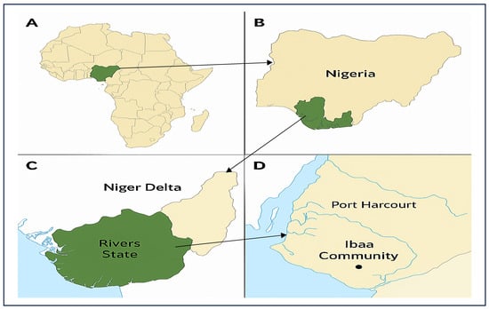 Maps showing the location of the study area. (A) Map of Africa showing Nigeria; (B) Map of Nigeria showing the Niger Delta region; (C) Map of the Niger Delta showing Rivers State; (D) Map of Rivers State showing Ibaa Community. Source: Compiled and modified from administrative boundary data (2025).