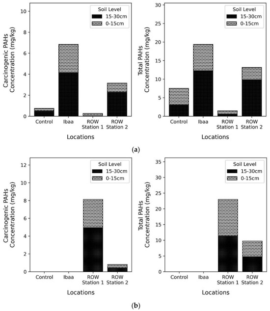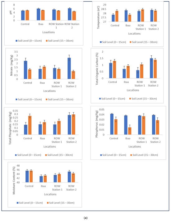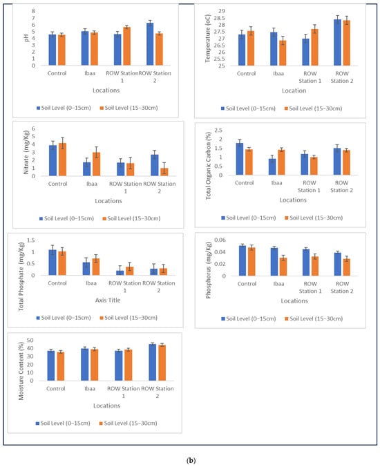 This study assessed the physicochemical properties of soils at four locations—Control, Ibaa, Right-of-Way (ROW) Station 1, and ROW Station 2—at two depths (0–15 cm and 15–30 cm) during the dry and wet seasons (Figure 2a,b). Parameters including pH, temperature, total organic carbon (TOC), moisture, nitrate, total phosphate, and available phosphorus were evaluated against international standards and contextualized through comparative studies in both African and European contexts.