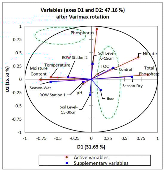 These findings concur with global observations. In East Africa, nitrate and phosphate have similarly clustered with dry season samples [,], while in Nigeria, moisture was negatively correlated with phosphorus in oil-impacted wetlands []. Comparable patterns have been noted in temperate soils of Brazil [], and soils under semiarid Mediterranean climate have shown distinct TOC components []. Studies in European agricultural soil also reported separate loadings for TOC and pH [] and variable phosphorus behavior across land-use types [], reinforcing the global relevance of the PCA structure observed.