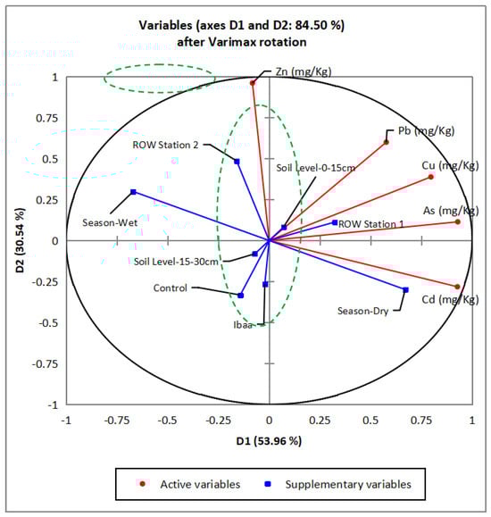 Biplot showing the relationship between the physico-chemical parameters. (The green circles highlight variable groupings: Pb, Cu, As, and surface soil (0–15 cm) in the upper right quadrant, and Season-Dry, and Ibaa in the lower right quadrant).