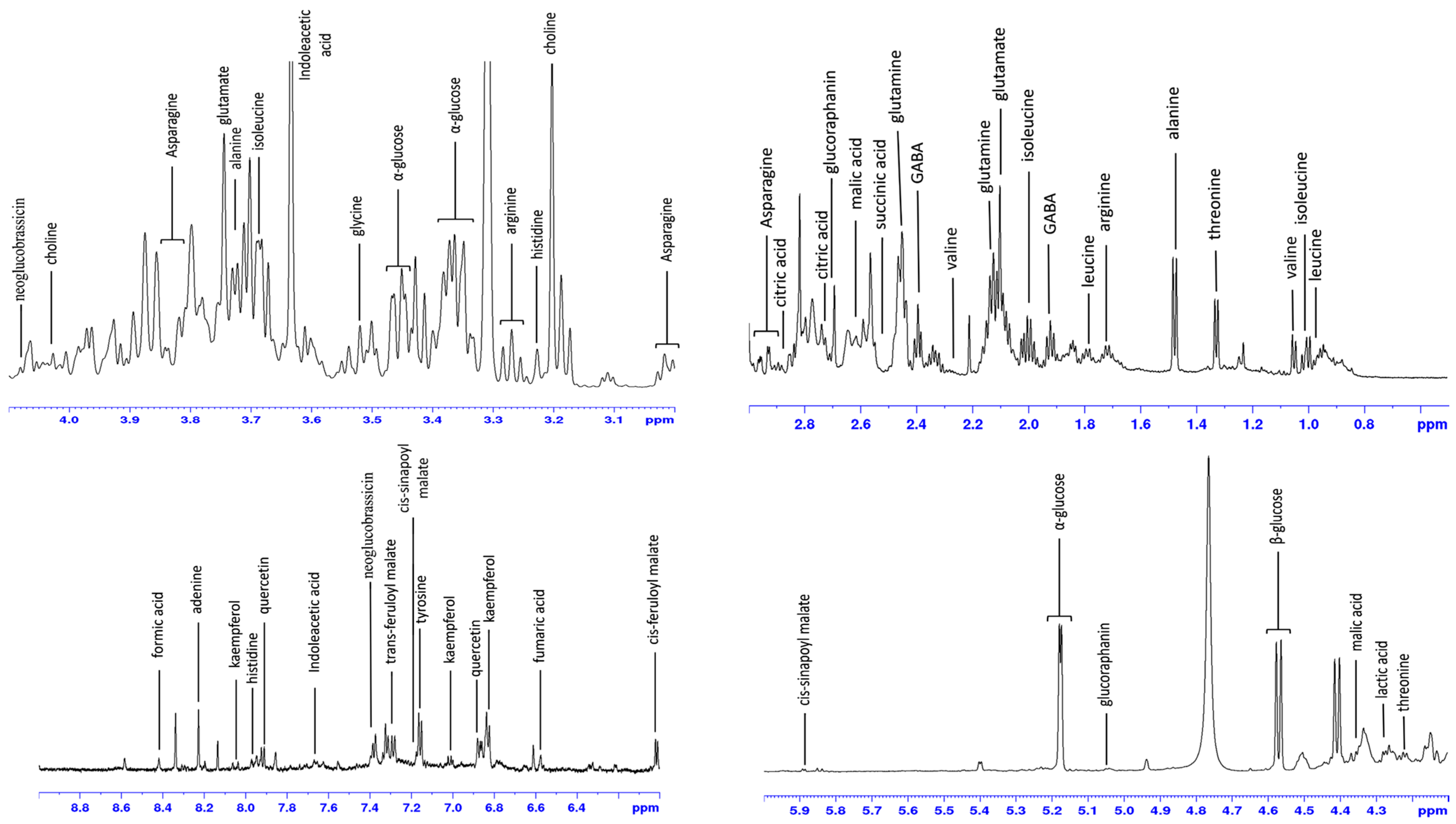 - Abdel-Farid, I.B.; Kim, H.K.; Choi, Y.H.; Verpoorte, R. Metabolic characterization of Brassica rapa leaves by NMR spectroscopy. J. Agric. Food Chem. 2007, 55, 7936–7943. [Google Scholar] [CrossRef]
