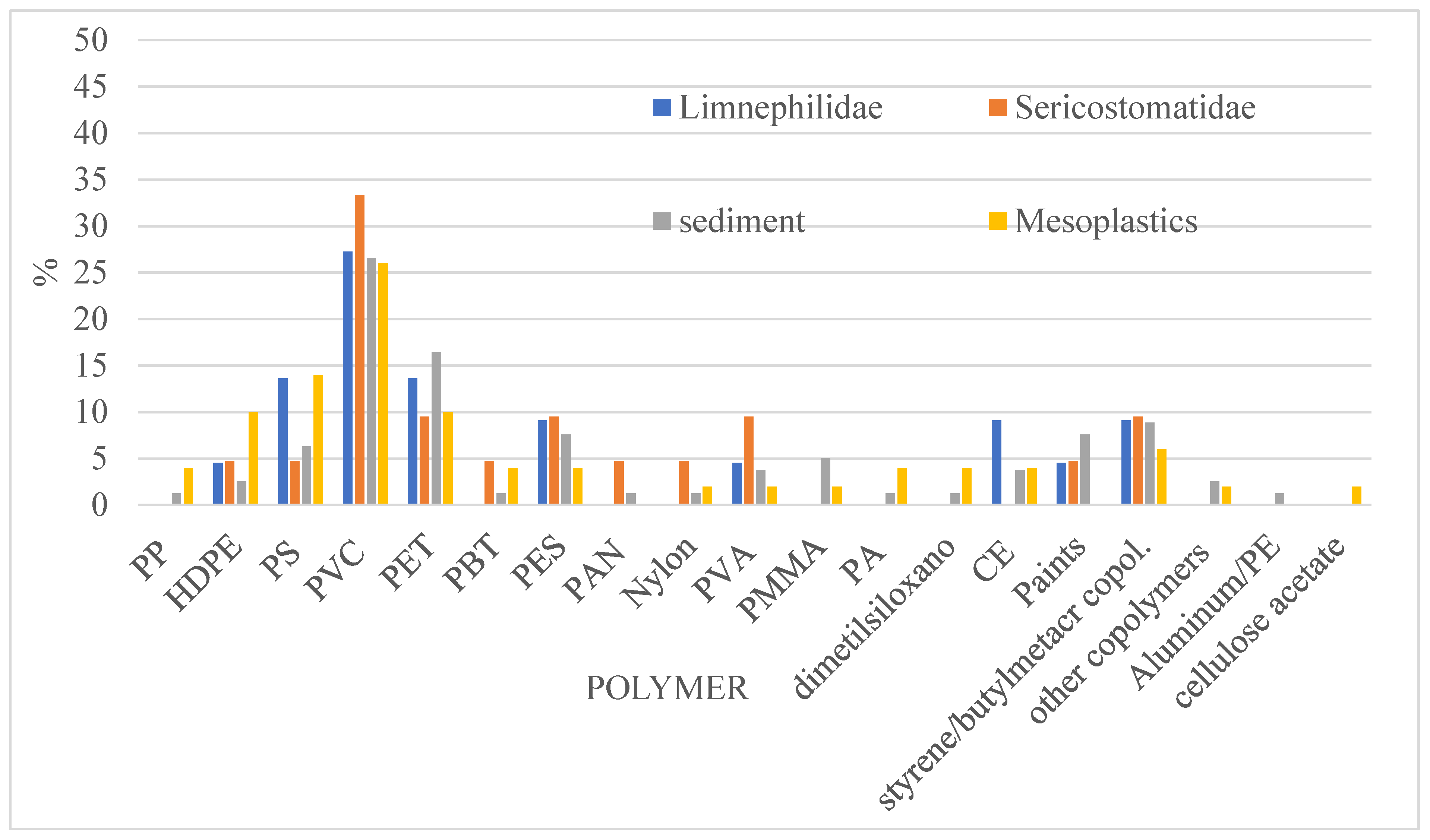 Gafos (E) | Lepidostomatidae Limnephilidae | LC | PVC, PET, PE, PP, PES, PSA | n.d. | [45] |