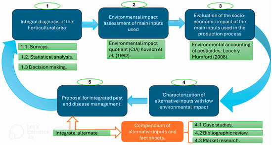 A five-phase method was used to diagnose and evaluate the impact of agrochemical use (Figure 1), which included socioeconomic, environmental, and technological variables. This approach facilitates the identification of key producer characteristics, such as age, education level, and gender. It also determines the impact by applying the Environmental Impact Quotient (EIQ) developed by [9] and the evaluation of the socioeconomic impact based on the primary inputs used, following the methodology of [10].