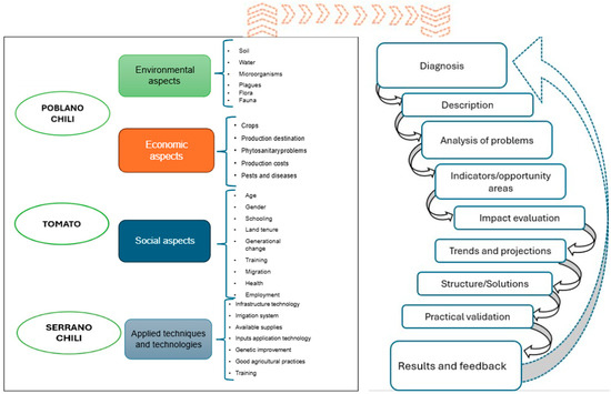 Figure 2 shows the context of the method, considering the main economically significant crops in Valle de Arista. Likewise, it includes their economic, environmental, social, and technological aspects, as well as the variables that integrate them, in order to determine the diagnosis and to enable the development of proposals.