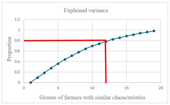 Explanatory variance according to respondent groups. The red line shows the proportion of explanatory variance. The blue line shows the number of clusters formed by key agents with similar characteristics.