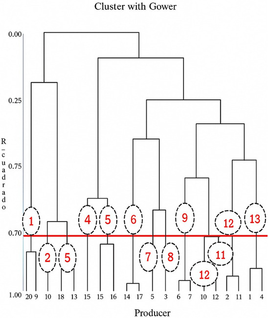 These stakeholders cultivate and technically manage the most economically important crops and cultivated areas in the study area. Statistical analysis was performed using descriptive statistics to explain the most important generalities of the key stakeholders’ production systems. To stratify the farmers, a principal components analysis was performed, and the variables that explained the greatest proportion of the variation were selected. Subsequently, the Gower similarity coefficient was calculated [22], considering that it is a measure of similarity that allows the simultaneous use of quantitative, qualitative and dichotomous variables and facilitates identifying the degree of similarity between individuals [22] to whom continuous, discrete and binary characteristics have been measured with the following equation: