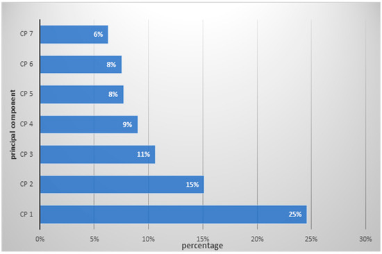 The cumulative or explanatory variance represents the contribution of each variable evaluated in the study and how they are distributed based on their statistical weight in the principal components (PC). The principal component analysis (PCA) showed that seven components accounted for 82% of the variance (Figure 5). PC1 linked the production infrastructure (open field, shade net, or greenhouse), type of crop (poblano chili, serrano chili, and tomato), production costs, and main pests, with a 25% variability.