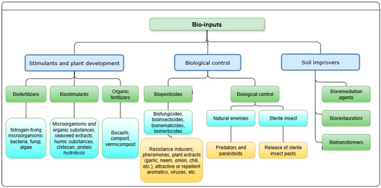 - Bullor, L.; Braude, H.; Monzón, J.; Cotes Prado, A.M.; Casavola, V.; Carbajal Morón, N.; Risopoulos, J. Bioinsumos: Oportunidades de Inversión en América Latina; FAO: Rome, Italy, 2023; Available online: https://openknowledge.fao.org/handle/20.500.14283/cc9060es (accessed on 17 February 2024).