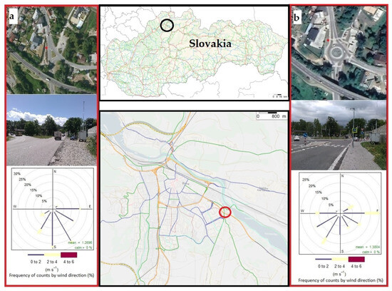 Location of the investigated intersection in Žilina city, Slovakia; (a) three-arm intersection, (b) roundabout; black circle—location of Žilina city, red circle—location of intersection.