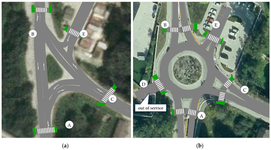 In the case of the three-arm intersection, the direction A-B represented the main traffic flow (Figure 2a), arm E in both cases of the intersection was not used at the time of the measurements and was therefore not included in the modeling (Figure 2).
