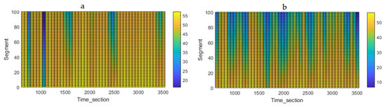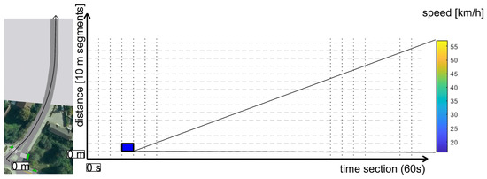 The microsimulation model assessed the smoothness of the traffic flow on each arm of the intersection (Video S1). The average speed of the entering vehicles was evaluated in 60 s intervals on 10 m segments. The data indicate an average speed reduction of 11% at the entrance to the roundabout, which is 6 km/h compared to the intersection with three arms. A graphical representation of the average speeds is shown in Figure 13. The horizontal axis represents the time interval of the microsimulation and the vertical axis the length of the segment. The color spectrum represents vehicle speed, ranging from 0 to 60 km/h.