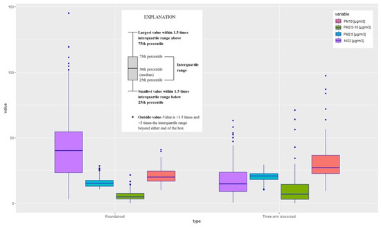 Boxplot for pollutants measured at intersections in the city of Žilina.