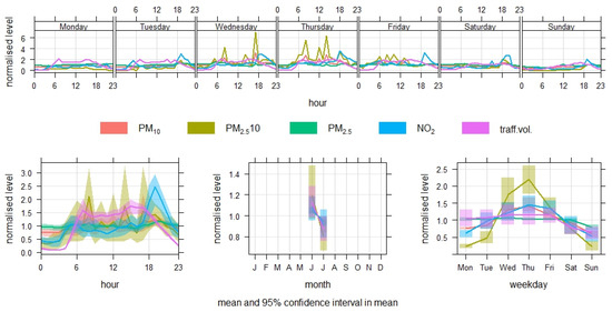 In the case of this study, the pollutants PM10, PM2.5, PM2.5–10 and NO2 and traffic volume were evaluated. In the case of an intersection with three arms, an increase in traffic volume was observed in the morning (7:00 a.m.) and afternoon (3:00 p.m.). Simultaneously, or with a small shift, we can observe an increase in NO2 and also in the coarse fraction of PM2.5–10 in these time periods. This trend can also be seen within the week, where traffic intensity reaches its maximum on Thursday and the maximums for the pollutants PM10, PM2.5–10 and NO2 correspond to this situation (Figure 5).