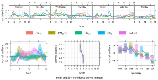 In the case of the roundabout, the trend of traffic volumes during the day is similar to the previous case. That is, the traffic volume reaches its maximum during the day between 7:00 a.m. and 3:00 p.m. However, a similar pattern was observed only for NO2. Within the week, we observe a maximum on Thursday, but the pollutant maxima no longer belong to that day (Figure 6). This observation confirmed similar behavior patterns between traffic volume, NO2 and PM2.5–10 at the three-arm intersection. For the roundabout, the relationship was primarily between traffic volume and NO2.