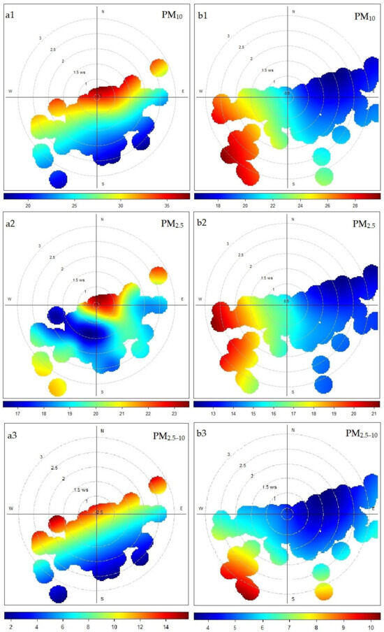 The polarPlot function is used to visualize a two-dimensional polar plot of concentrations, taking into account their relationship to wind speed and direction. The result is displayed as a smooth colored surface, which is created by modeling using smoothing methods. The plots processed in this way allow a quick assessment of the possible impact of pollution sources in a given environment. In this study, polar plots were used to reveal the distribution of pollutant concentrations according to the respective directions and wind speeds. The polar plots are arranged so that differences between the three-arm intersection and the roundabout for each pollutant can be directly compared (Figure 7). In the case of the three-arm intersection and PM10, PM2.5 and PM2.5–10 particulate matter, we observe high concentrations concentrated around the measuring point and are mainly associated with lower wind speeds (<2 m/s). They also correspond to the main direction and location of the intersection in relation to the measuring point (Figure 7(a1–a3)). The distribution of NO2 concentrations in the case of the three-arm intersection is similar to that for particulate matter. The highest concentrations are concentrated around the measuring point and are associated with wind speeds < 2 m/s (Figure 7(a4)). This situation can be interpreted as the generation of pollutants by road traffic at the adjacent three-arm intersection. On the other hand, we observe a distribution of particulate matter concentrations at the roundabout, where high concentrations are no longer near the measuring station, and therefore near the intersection itself. They are more likely related to higher wind speeds > 2 m/s (Figure 7(b1–b3)). This situation can be interpreted as a decrease in particulate matter concentrations directly from the source road traffic at the roundabout and high particulate matter concentrations are more likely related to a more distant source. For the NO2 pollutant bar, the effect of the roundabout is different from that for particulate matter. On the contrary, NO2 concentrations are more strongly concentrated at the roundabout and are more than twice as high as at the three-arm intersection. NO2 concentrations are associated with low wind speeds (<2 m/s) (Figure 7(b4)). Note that different concentration scales were applied in the polar plots to better highlight high-percentile values for each pollutant (Figure 7).