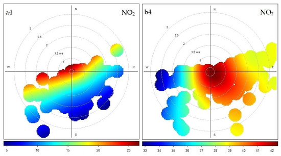 Polar graphs for pollutant concentrations: tree-arm intersection (a1–a4) and roundabout (b1–b4) (color scale values in µg/m3).